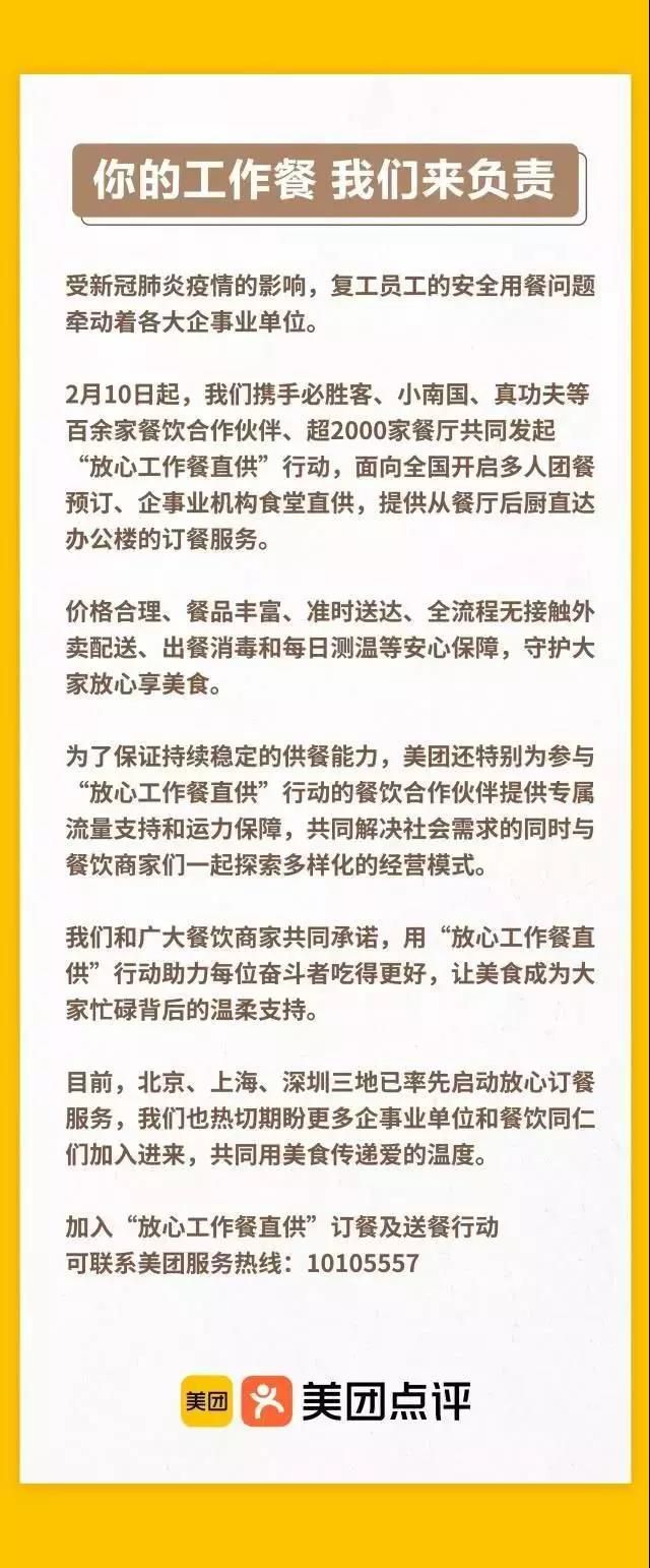 日前,美团宣布联合政府、协会等机构,在全国发起了“放心工作餐直供”行动。