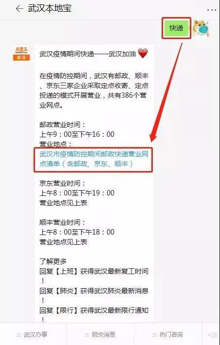 武汉市邮政寄递企业一方面保障防疫物资运输,另一方面也将尽力满足市民急需应急物资寄递,从1月23日至今收派件均超过百万件次。市民使用寄递业务有三种方式可选。一是拨打11183邮政上门揽收。二是使用丰巢智能柜自助寄取,用户可上丰巢智能柜微信公众号了解具体方法。三是到网点办理。全市邮政快递营业网点具体地点和营业时间,可到武汉市邮政管理局官方网站《动态信息》《消费提示》中查询。