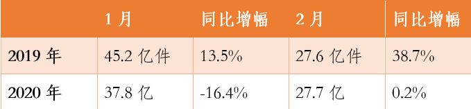 3月12日,国家邮政局公布2020年2月邮政行业运行情况。受新冠肺炎疫情影响,1-2月,全国快递服务企业业务量累计完成65.5亿件,同比下降10.1%;业务收入累计完成864.9亿元,同比下降8.7%。