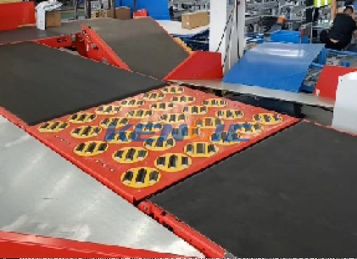 转向轮分拣机主要由输送部分、转动部分和整体框架组成。输送电辊筒通过皮带驱动轮子旋转,将货物向前输送,旋转电机在伺服控制器控制下精确驱动轮子旋转实现货物分分拣。转向轮分拣机是一种代替人工,提升物流分拣效率普遍使用的自动化分拣设备,可将输送主线上的货物快速、准确的分拣到相应的格口滑槽里。