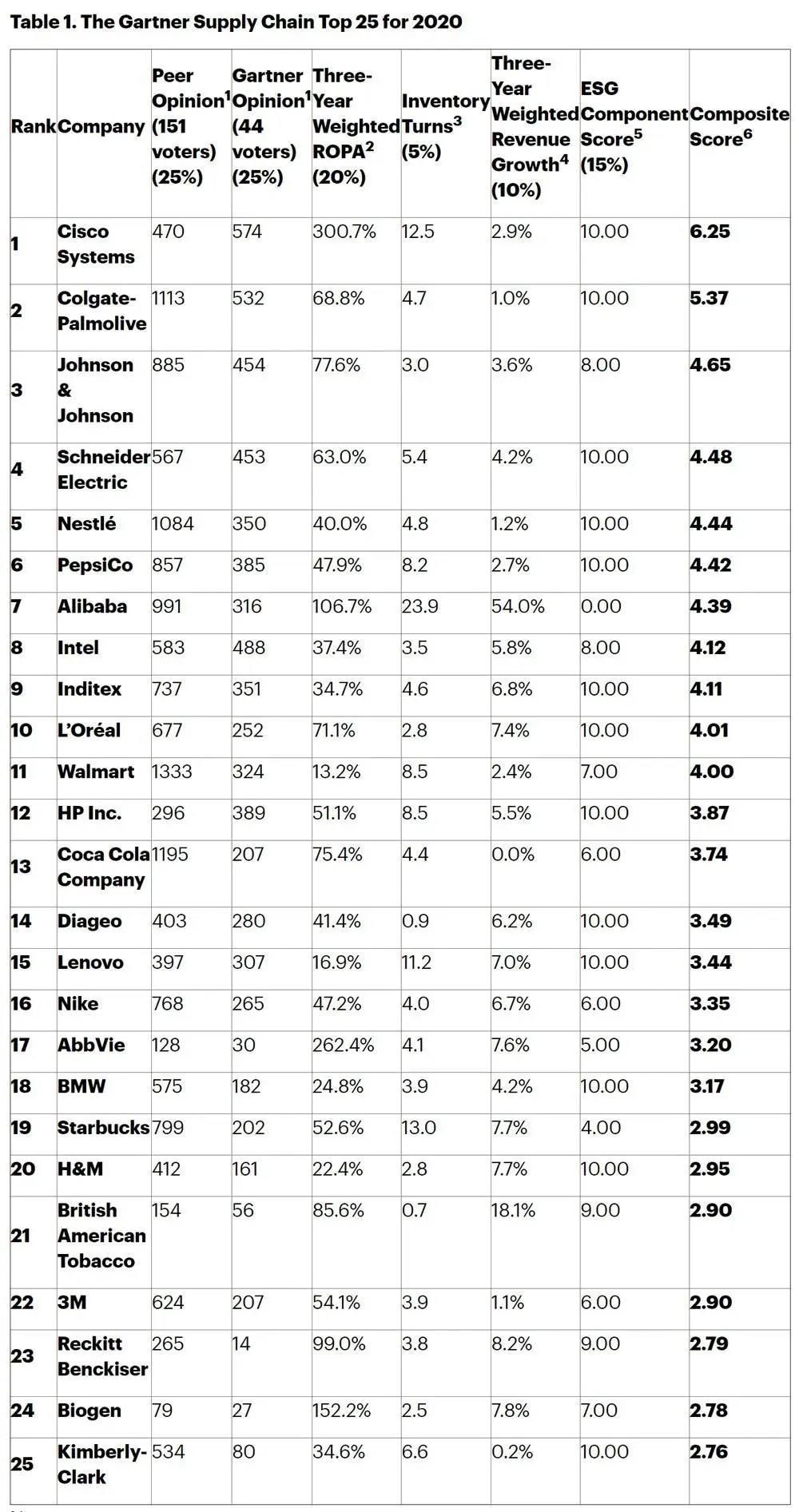 Gartner公布2020年全球供应链25强榜单,阿里巴巴、联想入围