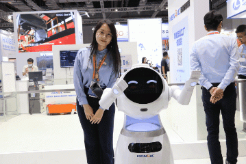 “大家好,我是本次展会的智能小助手机器人小科。别以为我只会唱歌、跳舞、讲笑话噢,帮助进行公司介绍、业务介绍、项目视频播放、实时疑问解答,我也是很擅长呢!不信的话,我在6.1H F015展位等你到19日,来跟本宝宝比试比试吧!