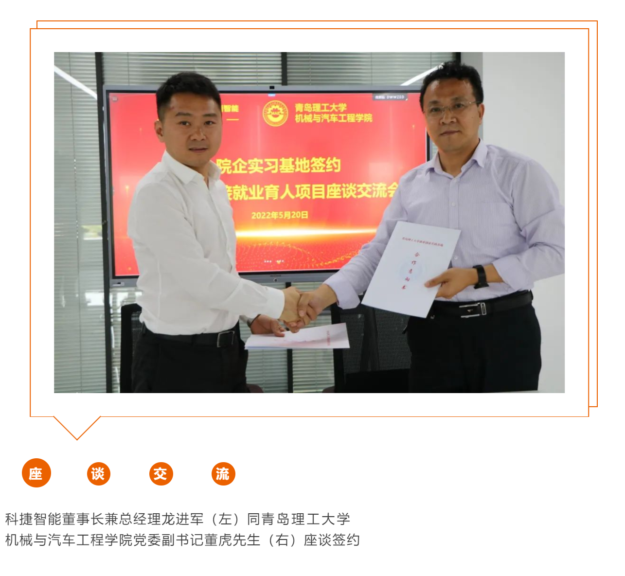 5月20日下午, 青岛理工大学院企基地签约暨供需对接就业育人项目座谈交流会在leyu.乐鱼智能成功召开,校方领导一行先到公司展厅、生产车间进行了参观,对公司的发展历程、生产经营状况等进行了深入的了解,参观过程中校方领导对企业的发展速度、研发能力、生产工艺等多方面给予了高度的评价与肯定。