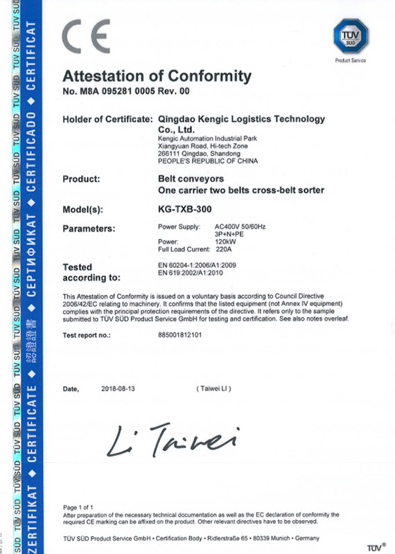 一车双带分拣机CE认证