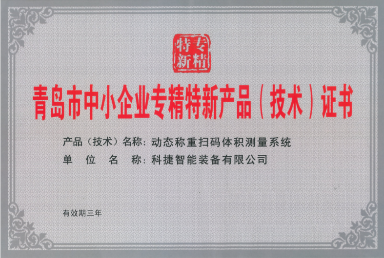 动态称重扫码体积测量系统专精特新产品证书